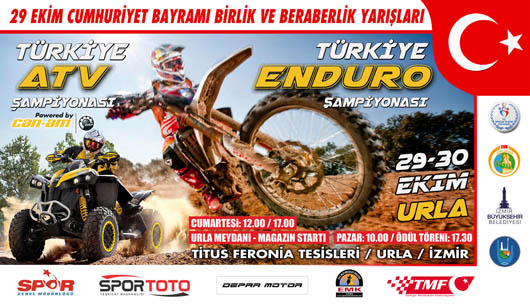 Türkiye Motosiklet Federasyonu’nun 2016 yarış takviminde yer alan Türkiye Enduro Şampiyonası 5. Ayak ve Türkiye ATV Şampiyonası 4. Ayak yarışları İzmir'in Urla ilçesindeki Titus-Feronia Doğa ve Motor Sporları Merkezi’nde düzenlenecek. Enduro ve ATV Şampiyonaları 29 EKİM CUMHURİYET BAYRAMI BİRLİK ve BERABERLİK YARIŞLARI kapsamında düzenlenecek. Türkiye Şampiyonaları 29 Ekim 2016 Cumartesi günü Urla Belediyesi Konferans Salonu’ndaki brifing ve ardından saat 12.00’de Urla Belediyesi önünde yapılacak magazin startı ile başlayacak.