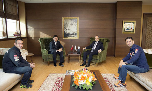 Bu sene 03 Ocak- 17 Ocak tarihlerinde gerçekleştirilen dünyanın en önemli motor sporları organizasyonu Dakar Rallisi’nde ilk kez finişe ulaşan Şakir Şenkalaycı ile Serkan Özdemir, Gençlik ve Spor Bakanı Akif Çağatay Kılıç’ı makamında ziyaret etti. Başkan Uçar ile şampiyon sporcularımız Bakan Kılıç’a teşekkür ederek plaket hediye etti.