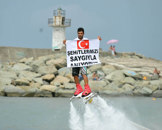 GÖSTERİLER NEFESLERİ KESTİ Abana meydanında yapılan kupa törenine vatandaşlar büyük ilgi gösterdi. İki gün Karadeniz’in dalgalarıyla mücadele eden sporcular kupalarına kavuştu. Sporcular kupalarını Abana Kaymakam Vekili Recep Koşal, Belediye Başkanı Rıdvan Oyar, Belediye Başkan Yardımcısı Ramazan Akçınar, TMF Asbaşkanı Hamit Dizman, Yönetim Kurulu üyeleri Mahmut Nedim Akülke, Okan Alp’ten aldı. Etkinlik kapsamında gerçekleştirilen motosiklet gösterileri izleyenlerin beğenisini topladı. Motosiklet şovmeni Birkan Polat yaptığı birbirinden güzel hareketlerle izleyenlerden büyük alkış aldı. Flayboard gösterisinde sporculardan Veli Özkan Piro, “Şehitlerimizi Saygıyla Anıyoruz” pankartı açıp, denizden Türk bayrağıyla çıktı.