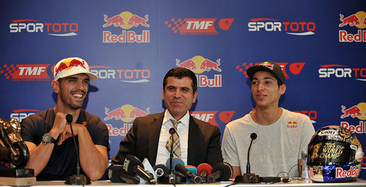 Fransa’da Dünya Supersport Şampiyonası’nın 11. ayağında dünya şampiyonluğunu ilan eden 2007, 2010, 2012’nin ardından 4. kez dünya şampiyonu olan milli sporcumuz Kenan Sofuoğlu, 2015 FIM Avrupa Superstock 600 Şampiyonu Toprak Razgatlıoğlu ve Türkiye Motosiklet Federasyonu Başkanı Bekir Yunus Uçar İstanbul’da Red Bull’un katkılarıyla basın toplantısı düzenledi. Toplantıya TMF Asbaşkanı Ogün Baysan, TMF Yönetim Kurulu Üyeleri Mahmut Nedim Akülke ve Ali Ulusan'da katıldı. Türkiye Motosiklet Federasyonu Başkanı Bekir Yunus Uçar, sporculara gerçekleştirdikleri şampiyonluk için teşekkür etti. Toprak’ın çok şanslı bir sporcu olduğunu belirten Başkan Uçar, “Fakat bu şans ifadesini kullanırken elde ettiği başarının şansa bağlı olduğundan bahsetmiyorum; yarışa çıkarken Kenan Sofuğlu gibi bir ustanın yanında yarışa çıkma şansı bulduğu için çok şanslı. Toprak cesaretiyle ve karakteriyle bu şampiyonluğu hak etti” diye konuştu.