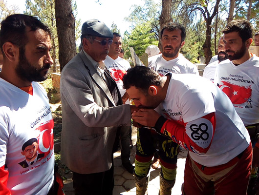 TMF Yönetim Kurulu Üyesi Mahmut Nedim Akülke’de duygulu anlar yaşarken, "Şehit Ömer Halisdemir’i yetiştiren babası Hasan Hüseyin Halisdemir’in ellerinden öpmek istiyorum. Ülkem adına Allah razı olsun" diyerek baba Halisdemir’in elini sporcularla birlikte öptü.