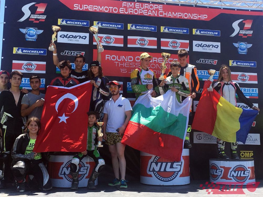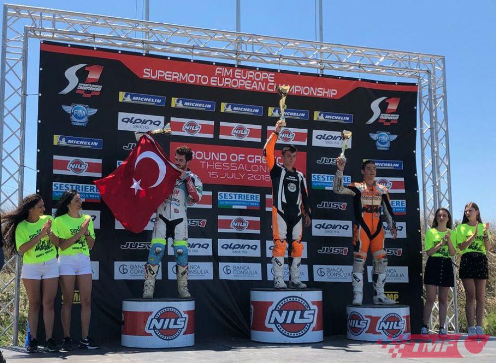 Yunanistan’da yapılan Avrupa Supermoto Şampiyonası’nda Türkiye takım olarak ikinci oldu. Sporcularımızdan Mücahit Zengin, Baran Bulut Kocaman ve Aras Efe Yıldırım ödül kürsüsüne çıkma başarısını gösterdi. Avrupa Supermoto ve Balkan Supermoto Şampiyonaları Selanik şehrinde düzenlendi. 10 yarışçımızın katıldığı şampiyonada S3 sınıfında Mücahit Zengin ikinciliği elde etti. Bu sınıfta Mehmet Çelik 4., Ata Kahvecioğlu 5. ve Emirhan Erkan’da 6. oldu.