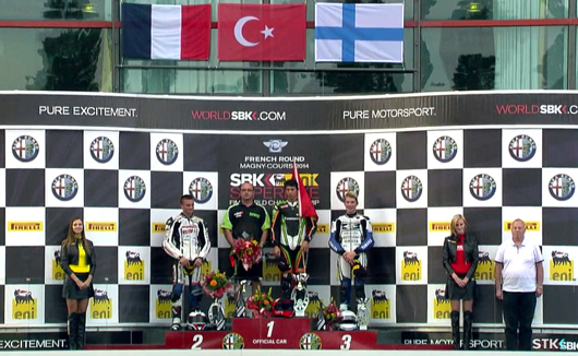 Türkiye'nin en genç şampiyonu Toprak Razgatlıoğlu, 40 sporcunun start aldığı Fransa’da koşulan FIM Avrupa Superstock 600 Şampiyonası'nda damalı bayrağı ilk sırada görerek birinci oldu. Dünya şampiyonu Kenan Sofuoğlu’nun destek verdiği Toprak Razgatlıoğlu yarışa ikinci cepten start aldı. İlk viraja lider giren Razgatlıoğlu, birinci giderken yaşanan kazada yarış kırmızı bayrakla durduruldu. İkinci kez start alan yarışta rakipleriyle başa baş mücadele eden sporcumuz damalı bayrağı ilk sırada görerek ilk kez çıktığı yarışı birincilikle tamamladı.Taraflı tarafsız bütün yarışseverlerin beğenisini kazanan Razgatlıoğlu, kupa kaldırırken büyük alkış aldı.