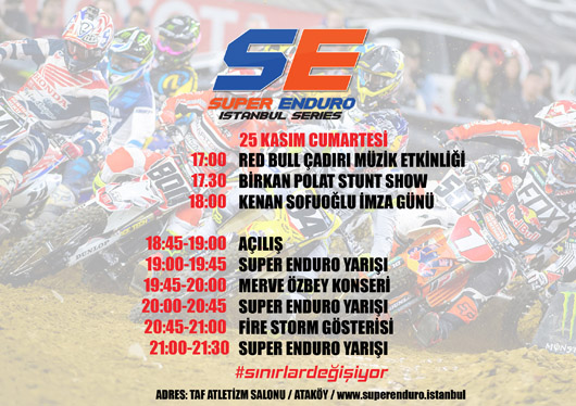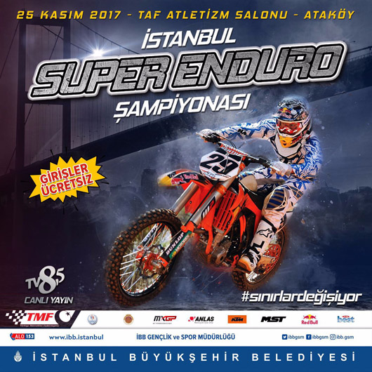 İstanbul Super Enduro Şampiyonası (SE) Türkiye Motosiklet Federasyonu ile İstanbul Büyükşehir Belediyesi Gençlik ve Spor Müdürlüğü işbirliğiyle Ataköy TAF Atletizm Salonu’nda yapılacak.Salonda hazır halde bulunan motokros pisti değiştirilerek süper enduro parkuruna dönüştürülecek. Sporcular, rampaların yanı sıra kaya, taş havuzu, lastik havuzu, kütükler, odun havuzu gibi zorlu engellere karşı, güç ve dayanaklılık sınavı vererek, inanılmaz bir mücadele ortaya koyacak.